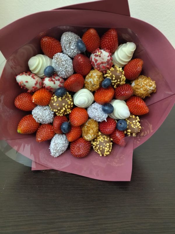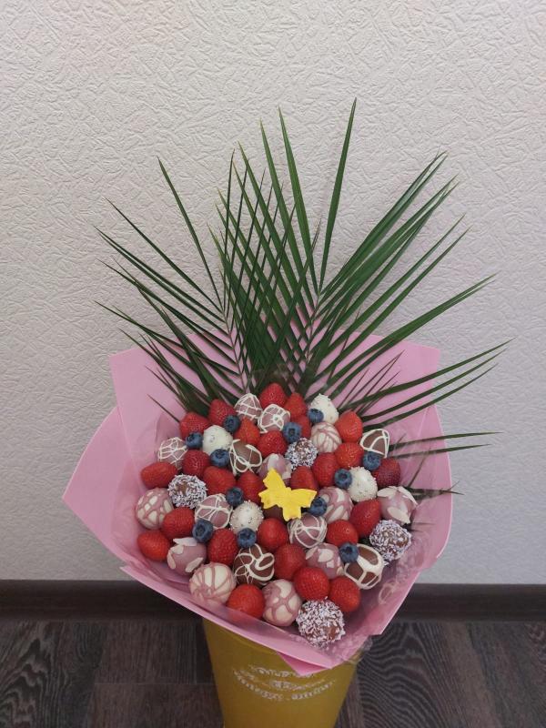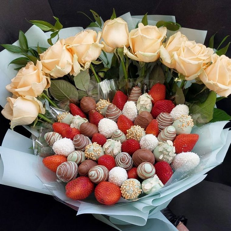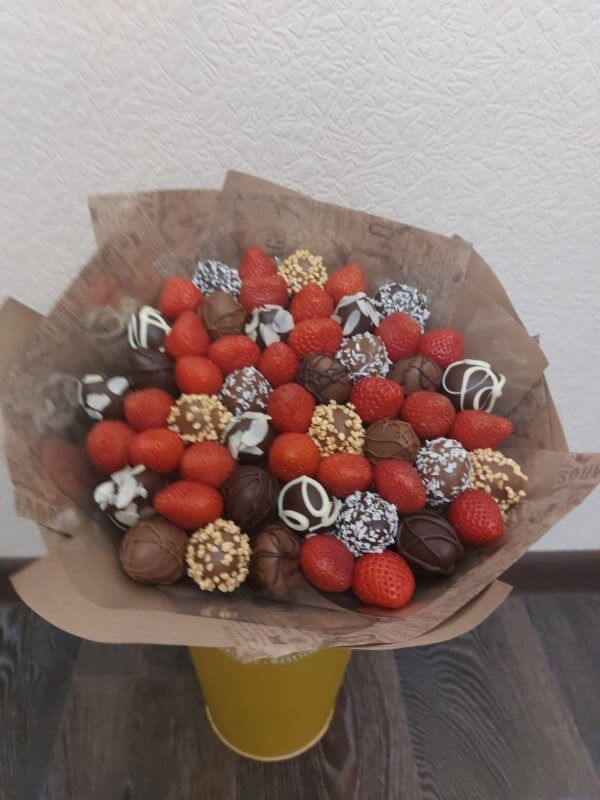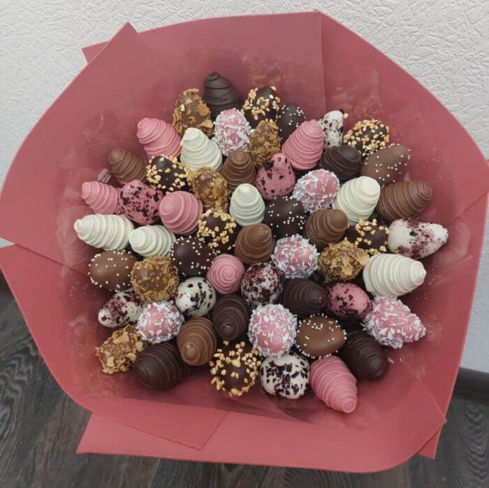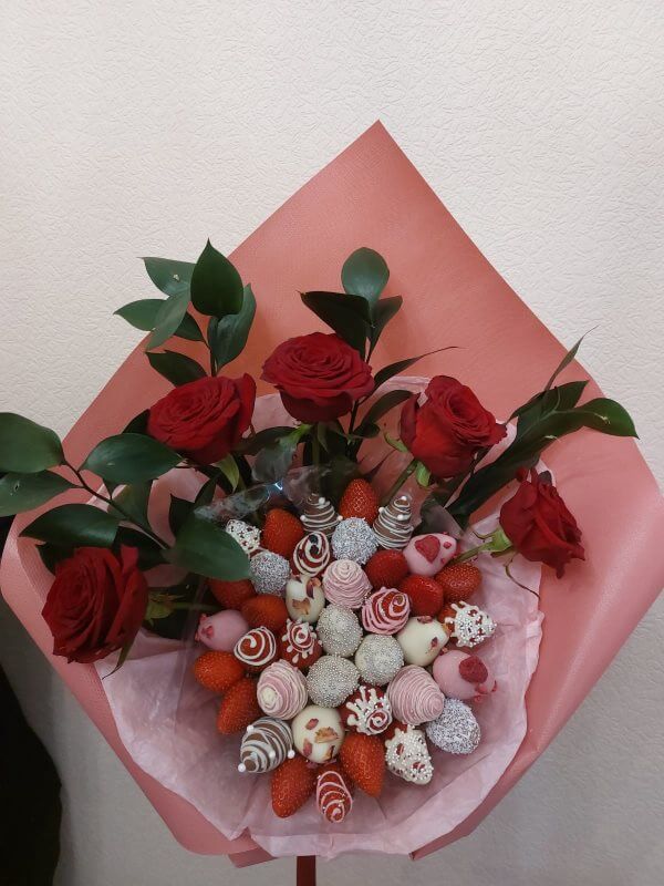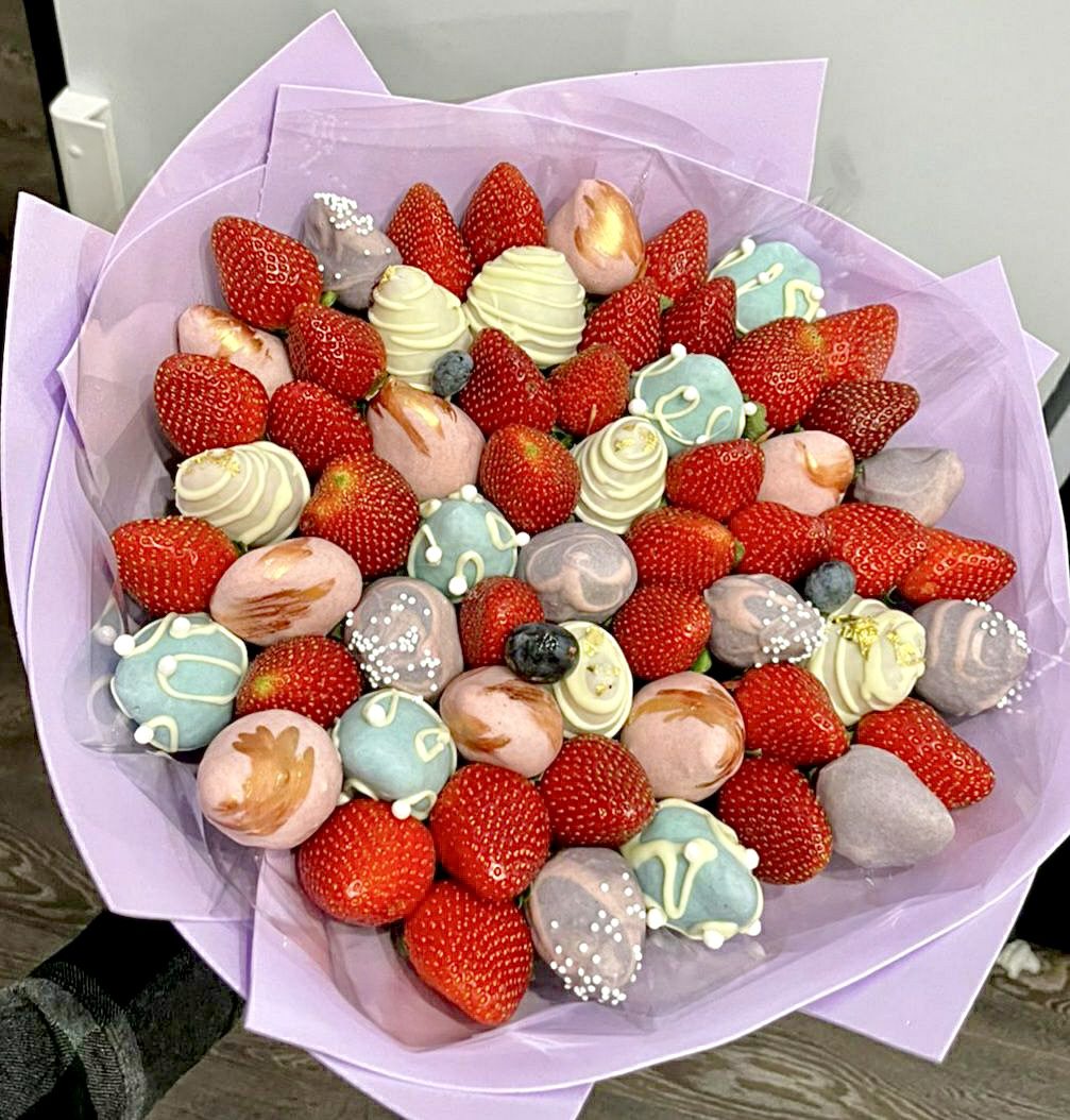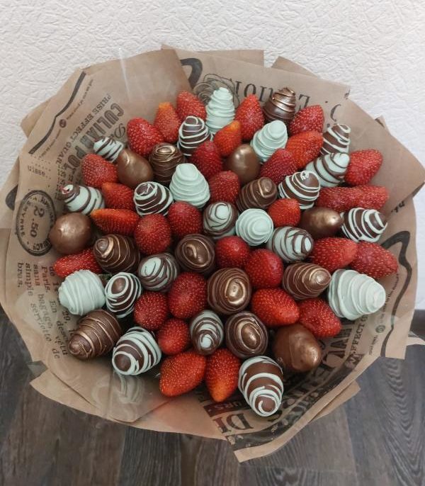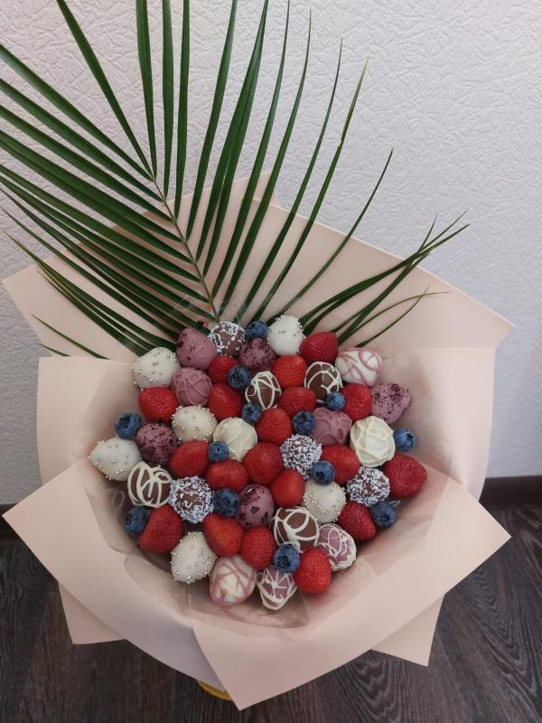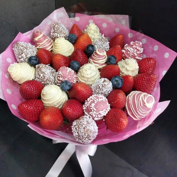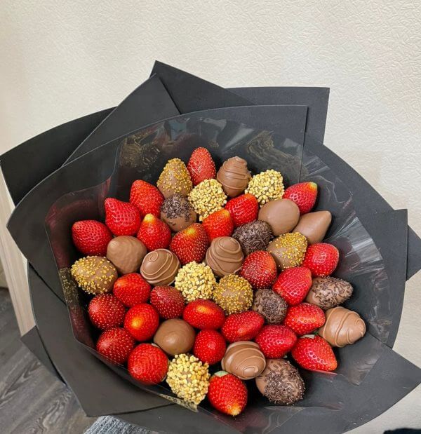 Букет из клубники в шоколаде — не просто красивый съедобный букет, а настоящее произведение искусства, которое точно порадует вашу вторую половинку. В нашем ассортименте есть букеты с добавлением свежих ягод, а также натуральных цветов.