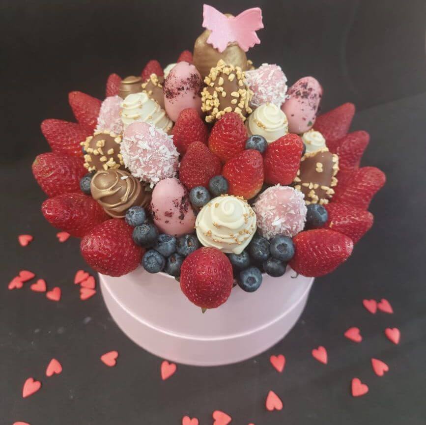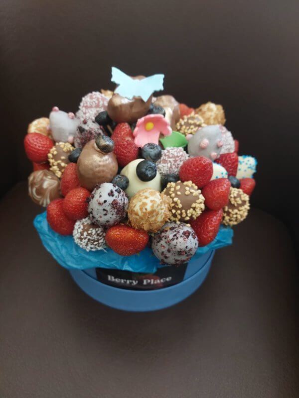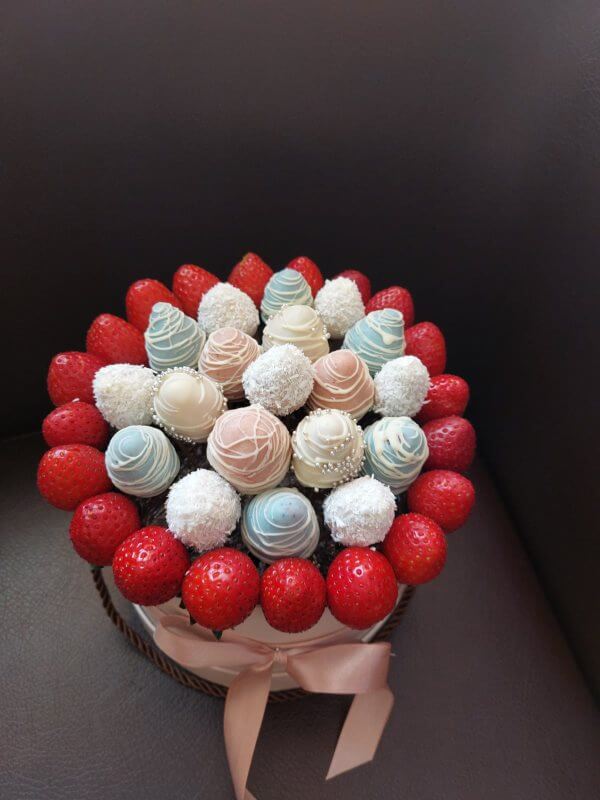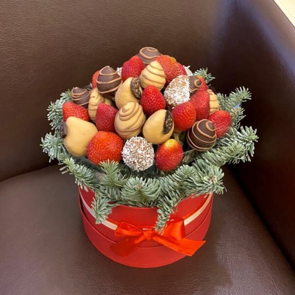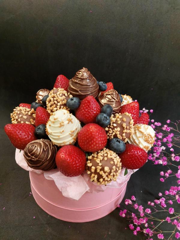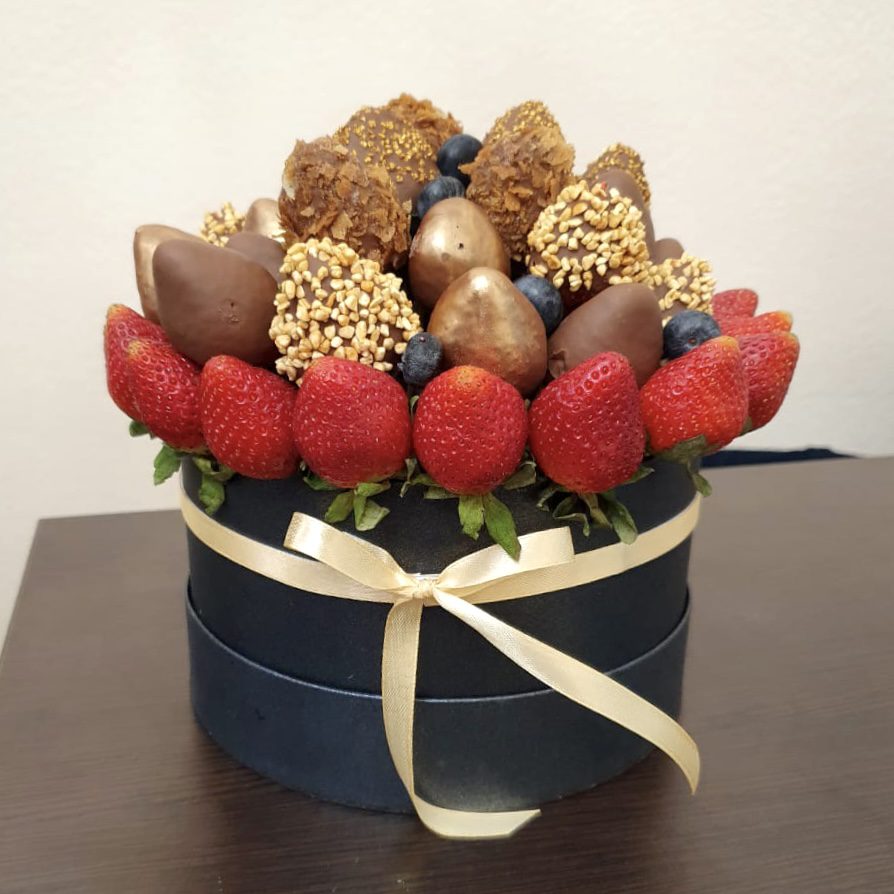 Преимущества букета в шляпной коробке — ягоды преркрасно сохраняются, подарок выглядит стильно и солидно.