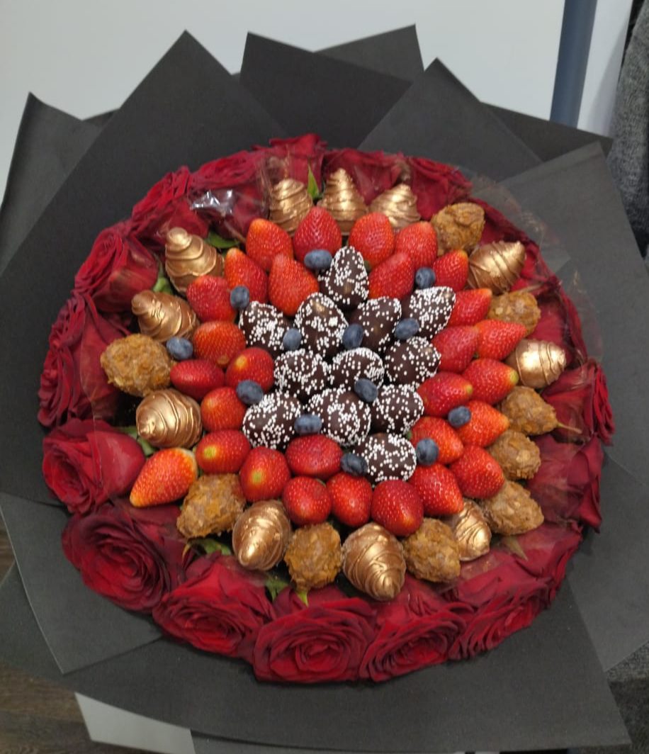 Розы 21шт. Клубника 900гр. Шоколад 150-200гр.