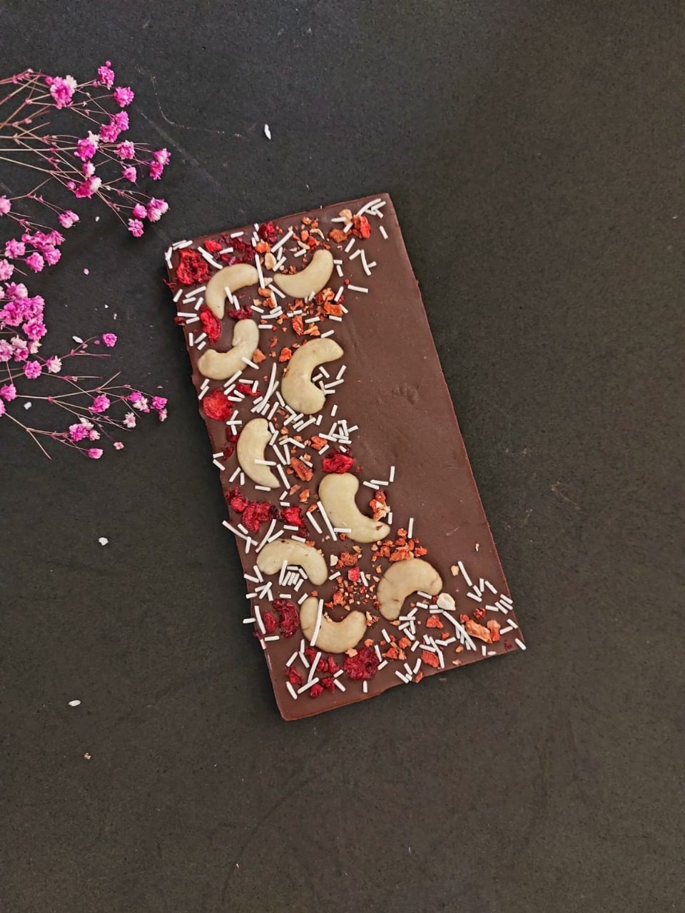 Декор кондитерский, сублимированная ягода, сублимированная вишня, орехи кешью, сахарные палочки.